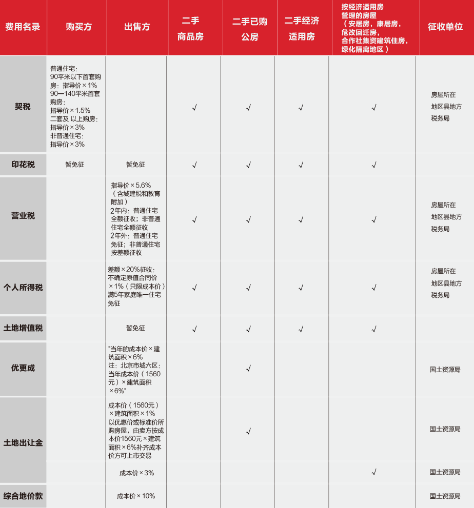 二手房交易中,买卖双方还需向税务部门缴纳交易的各类税种。其中契税、印花税等是必须要缴纳的税种,而税、营业税、综合地价款、优更成等因房产购买年限、是商品房还是经济适用房的不同在交易中产生不同的税收标准。