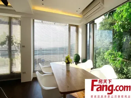 借自然之光,打造清新浪漫大户型空间。不加赘饰简洁的天花造型,整体空间呈现干净的开阔感;考虑到安全与美观的狭长型开窗,彷佛伸手就能摸到绿意。