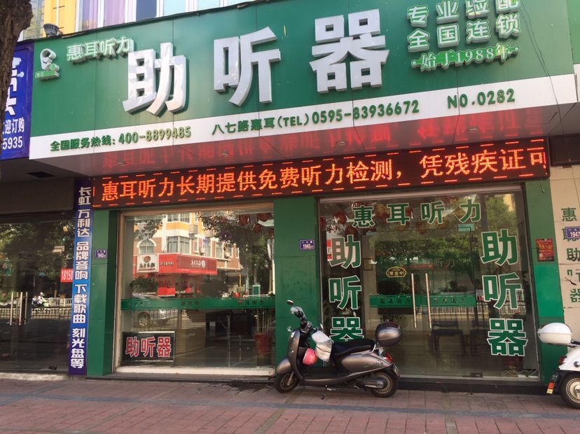 石狮八七路东段妇幼保健院往东200米有家助听器店,助听器是一个小型扩音器,把原本听不到的声音加以扩大,再利用听障者的残余听力,使声音能送到大脑听觉中枢,而感觉到声音。主要由传声器、放大器、耳机、电源和音量调控五部分组成。助听器按传导方式分为气导助听器和骨导助听器;按使用方式分类为盒式、眼镜式、发夹式、耳背式、耳内式、耳道式、深耳道式助听器。