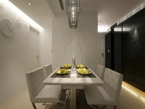 华丽炫彩小户型,玄关旁的柜体采用黑镜设计,拥有鞋柜及书柜收纳空间;沙发背墙的雕刻板雕刻着白色花朵图腾不间断的顺然而上,搭配对比的黑色镜面,交揉出视觉的佳效果。
