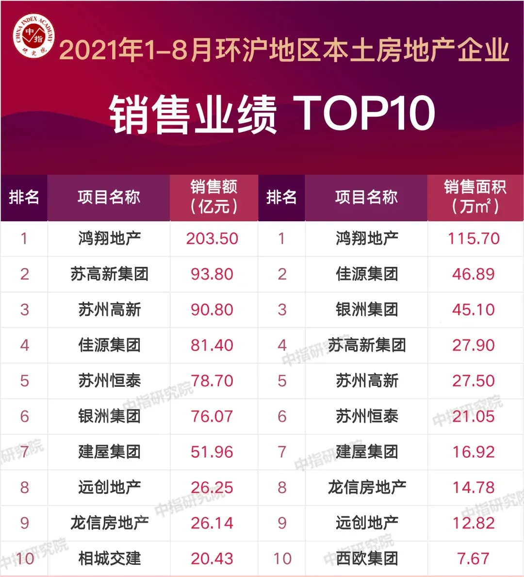 2021年1-8月环沪地区房地产企业销售业绩TOP10