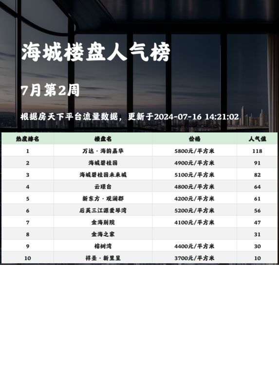 🏡🌟人气楼盘榜单的重要性不言而喻!选房买房是一件大事,找到理想的家园不仅能让生活更舒适,还能带来持久的价值。当前市场中,购房者最关心的莫过于地段、配套和价格。今天,我们来看看海城最热的三大楼盘,给大家提供实用的参考信息。