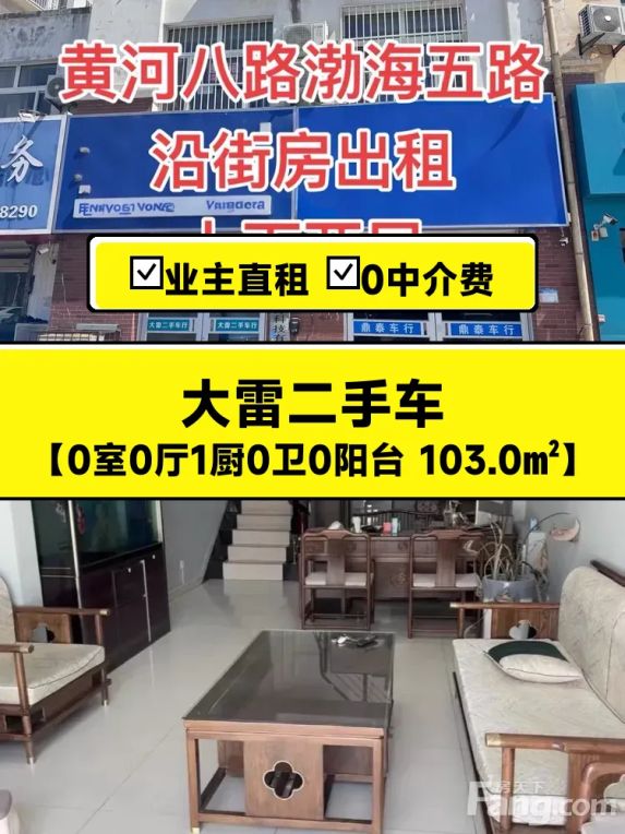 现有黄河八路渤海五路东北角沿街房对外出租,楼上楼下两层,100平方,(有两间,可单租,也可以一起租)采光好,二楼可住人,一楼可以做生意,办公家具一应俱全。