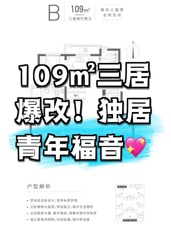 租房被奇葩户型坑过5次的我来现身说法!看这个109平三居时疯狂翻户型图找bug,结果越看越上头是怎么回事?南向双卧室中间夹着卫生间的布局,半夜上厕所不用穿越客厅!L型厨房转角竟然做双开门冰箱位,本烘焙爱好者狂喜!