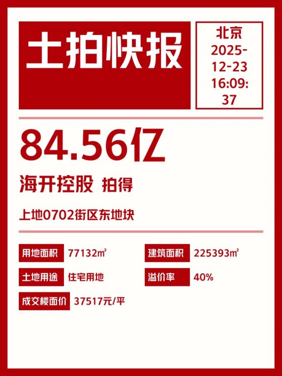 🏷️海开控股以84.56亿元竞得海淀上地0702地块!成交综合楼面价37517元/㎡,溢价率0.40%。地块规划建筑面积超22.5万㎡,涵盖居住及多功能用途。