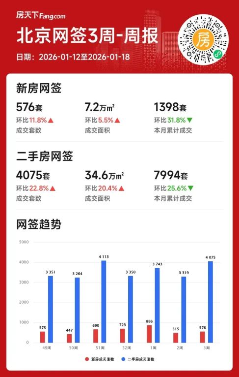 ✨北京楼市2026年第三周(1.12-1.18)成绩单出炉!本周新房成交576套(+11.8%),二手房更是突破4075套(+22.8%),市场活力肉眼可见回升~