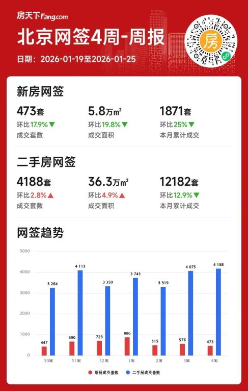 ✨北京楼市这周上演冰火两重天!据1月19日-25日最新数据,新房成交473套(环比-17.9%),二手却逆势达成4188套(环比+2.8%),市场格局正在发生微妙变化~