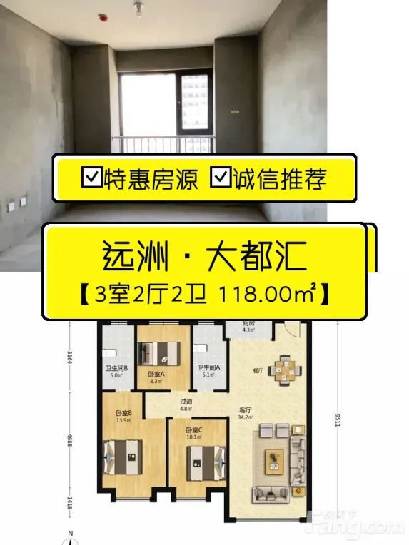 业主急售!远洲·大都汇大三居,南向采光好!