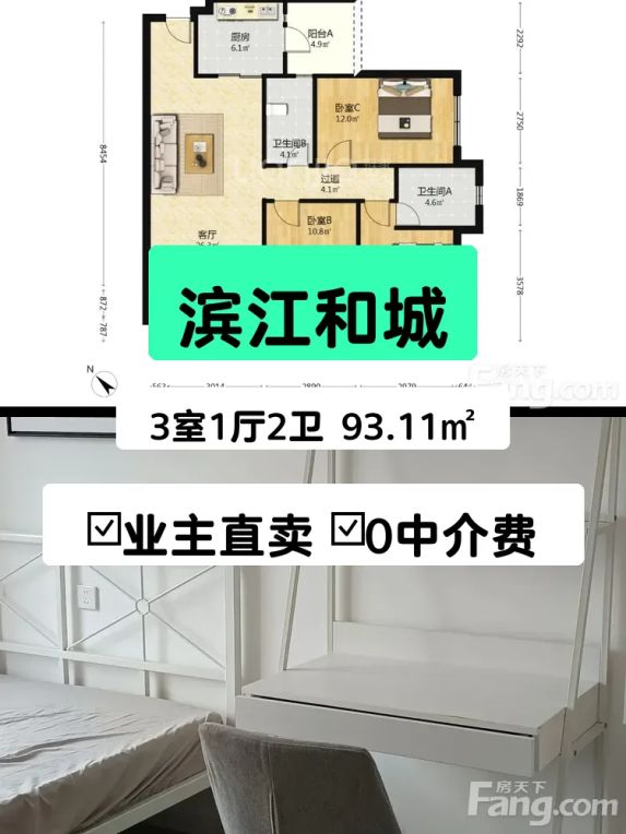 东南向三居室,滨江和城93平精装房165万