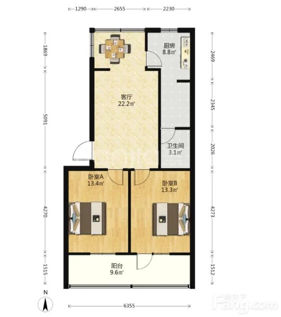 户型是2室2厅1厨1卫1阳台,南北朝向