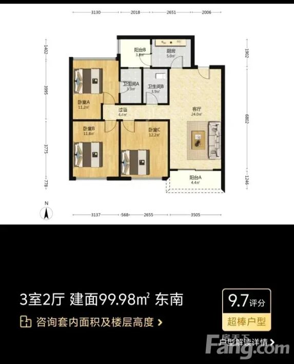 重点说说户型:三个卧室都很方正,主卧能放下1.8米大床还有余,客厅开间3.6米,一家人其乐融融完全不会挤~厨房是L型的,做饭特别顺手!