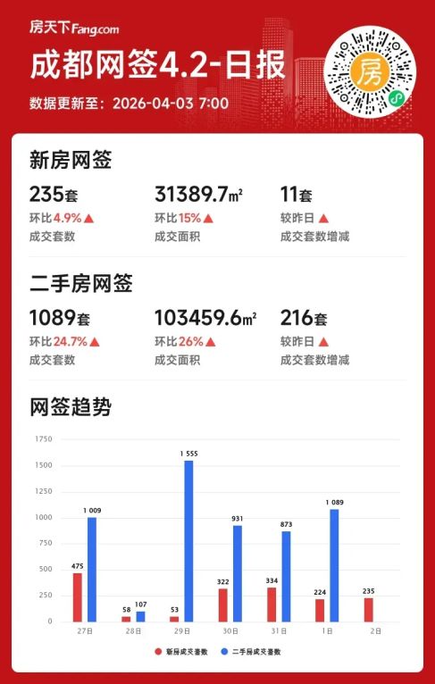 2026年04月02日成都楼市单日回暖二手房成交环比涨近25%