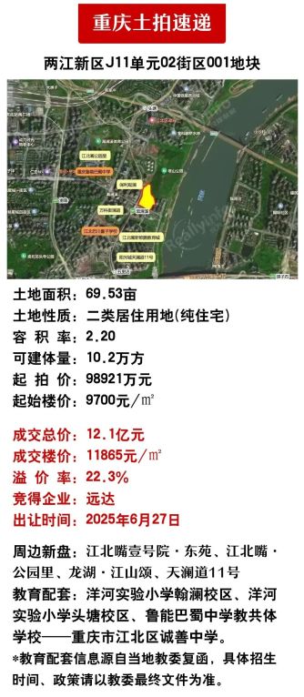 联发、保利、中海、海成、远达等大佬争了 111轮!后被 远达以12.1亿拿下,楼面价 11865元/㎡,溢价率 22.32%!
