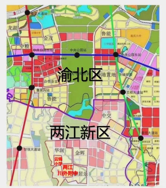 从行政区域上来讲是渝北区,从经济管理层面却分为两个区域:渝北区、两江新区。具体分界线大致在腾芳大道一带,图中紫线位置。(图2)