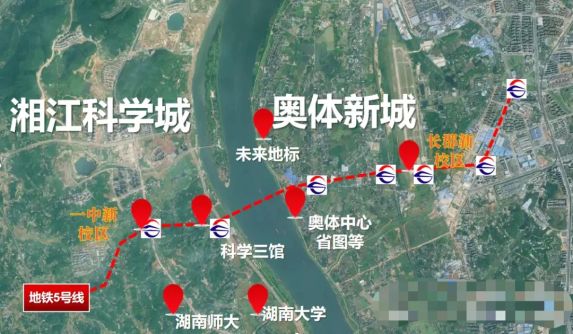 5号线成湘江两岸发展动脉,串联奥体新城(奥体中心、省图)与湘江科学城(名校新校区、三馆),形成新版"山水洲城"格局。