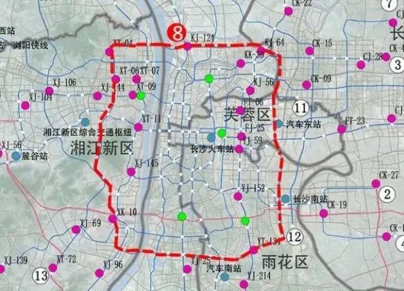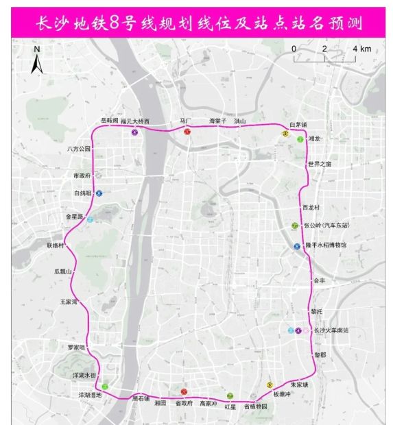 8号线是长沙地铁规划中唯一的环线,串联湖南金融中心、金鹰影视城、长沙南站、省府新城、洋湖新城、大学科技城、市府新区等重点片区。(图3为网传地铁站点预测)