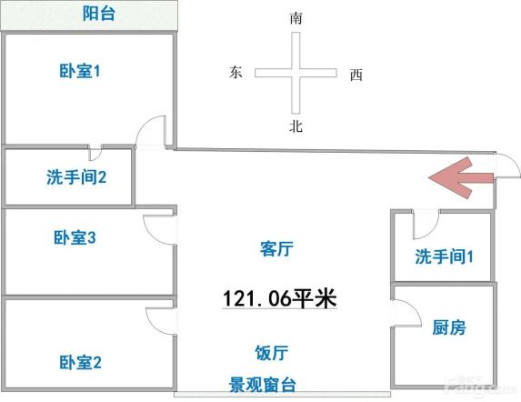 建筑面积121平米,户型3室2厅2卫,南北通透,大阳台,南向优良景观视线。