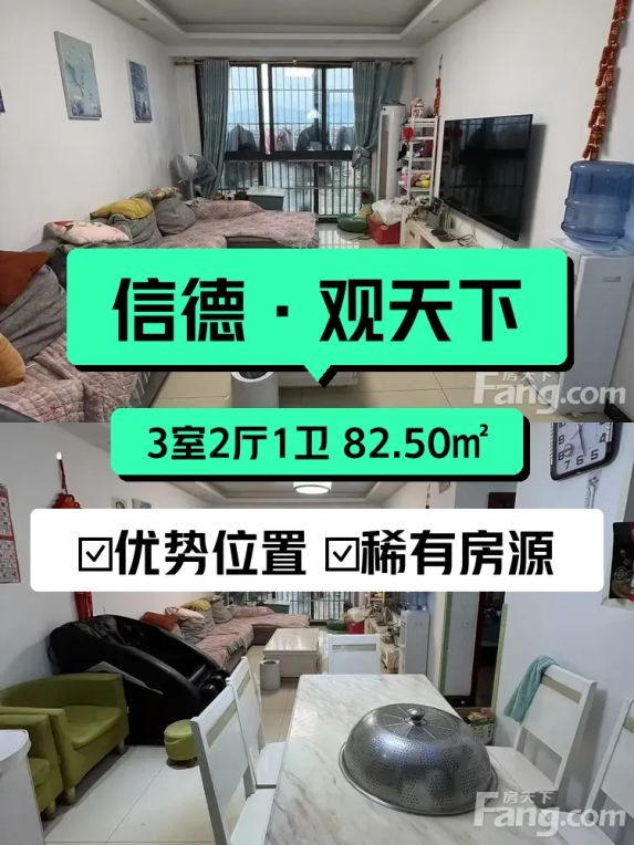 想给大家介绍一下我家这套超值的房子,位于信德·观天下小区,地址在金龙大道100号,交通特别方便。房子是82.50平米的三室两厅一卫,户型设计非常合理,空间利用率高。我家在34层,是顶层哦,视野超级开阔,朝东西方向,采光非常好,白天阳光洒满整个房间,住起来特别舒服。
