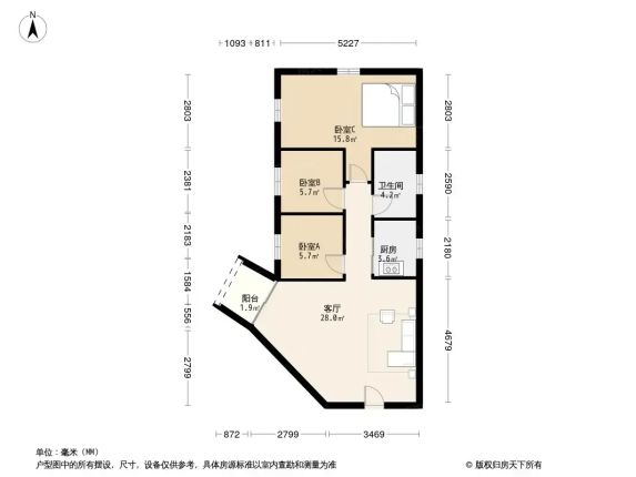 户型是3室2厅1卫,东北朝向