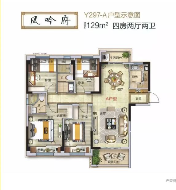 户型是4室2厅2卫,东朝向