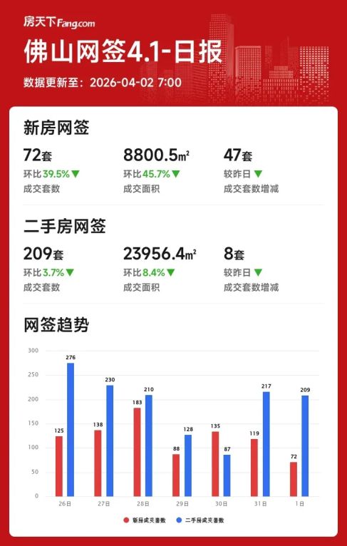 2026年04月01日佛山楼市数据出炉!新房成交缩水明显