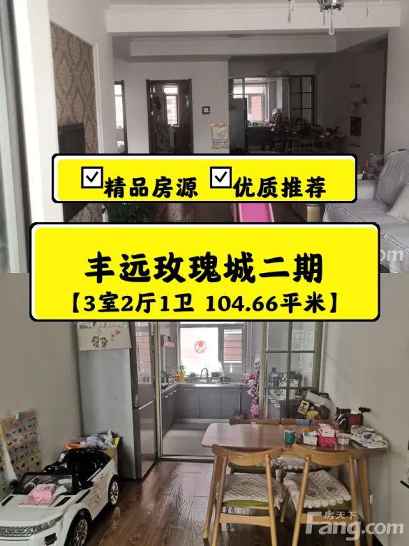 婚房出售,丰远玫瑰城二期尚品,3室2厅1卫的,面积104.66㎡,空间布局合理,该房源位于3层,总楼层6层,公摊小,南北朝向(把西山),采光和通风特别特别好,俗称亮堂(卫生间都有窗),照片为阴天拍的可以看见采光效果,冬季地暖温度在25度以上,(从建房到装修每一处的隐蔽工程都有照片留底,了解每一处细节,入住更安心)婚房装修,拎包即住。售价59.50万