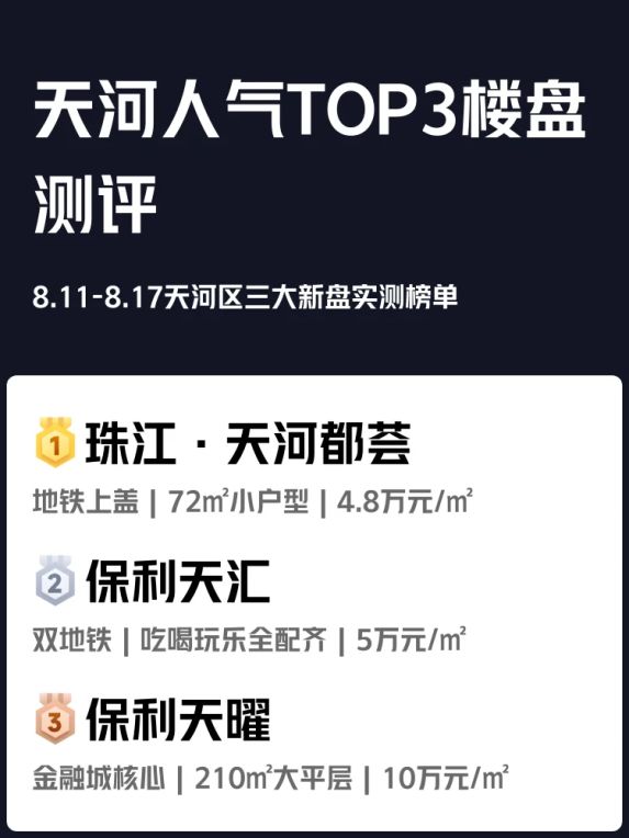 🔥上周(8.11-8.17)天河区三大新盘杀疯了!单价4.8w到10w的楼盘到底怎么选?实测榜单一手情报来啦!