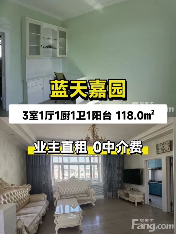 房子在**蓝天嘉园**,长江路4号,位置超方便!118平的大三居,南北通透,阳光从早晒到晚🌞 我家是6楼(共7层),爬楼不累还能锻炼身体~精装修,家具家电全配齐:冰箱、洗衣机、电视、热水器一应俱全,连燃气灶和抽烟机都备好了,直接拎包就能住!