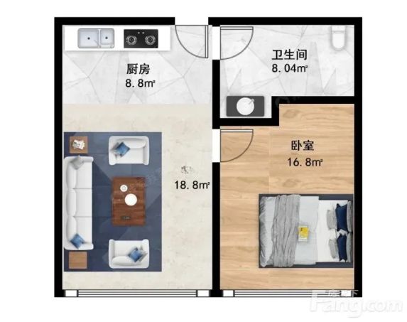 方建筑面积83.43平方,一室一厅一卫一厨格局,有1.8米的大床,中央空调,三开门大冰箱,8公斤滚筒洗衣机,嵌入式双灶电磁炉,嵌入式抽油烟机。