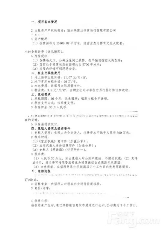 丽水体育生活可租赁区域对外出租的公示