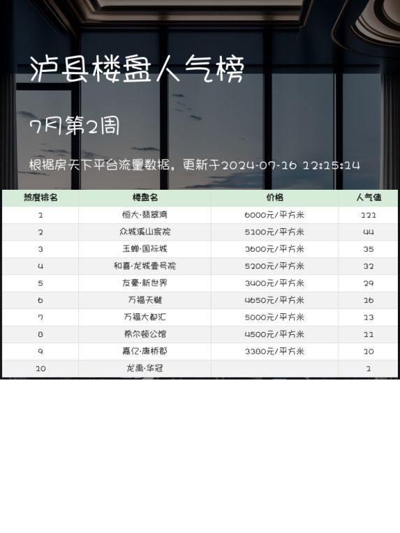 在泸县,选择一个合适的家🏡,不仅仅是房子的选择,更是对未来生活品质的把控。因此,关注人气楼盘榜单尤为重要。这些榜单汇集了购房者们的真实评价和市场反馈,能够为您提供有价值的参考信息,助您在购房之路上少走弯路🚶♂️。