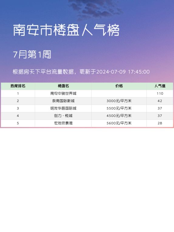 南安市人气楼盘榜单,南安中骏世界城热度第一!