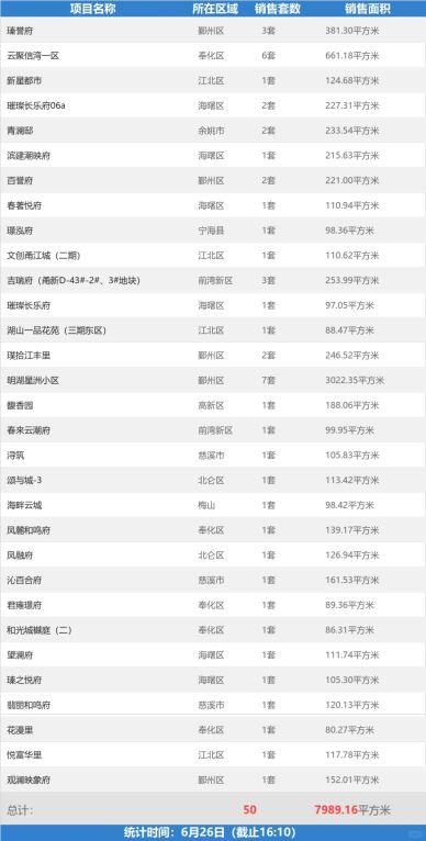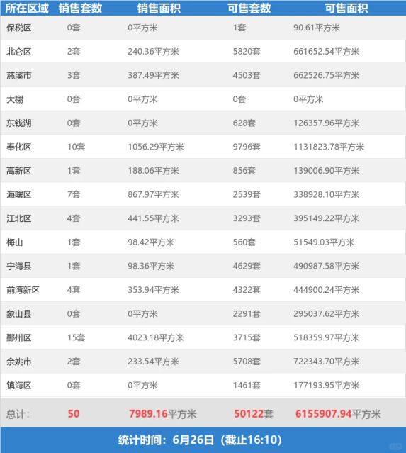 6月26日(截止16:10),宁波新房网签50套,网签面积7989.16平方米,可售套数50122套,可售面积6155907.94平方米。