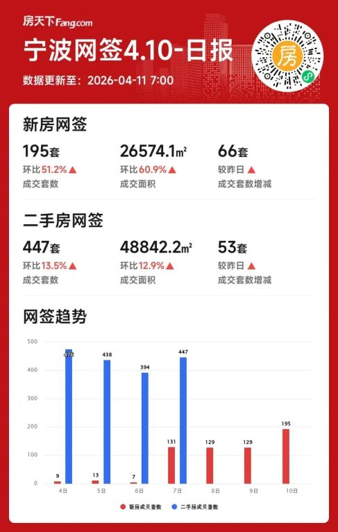 2026年04月10日宁波楼市单日新房成交激增,二手市场表现平稳