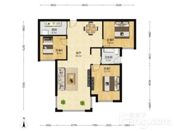 户型是3室2厅1卫,南朝向