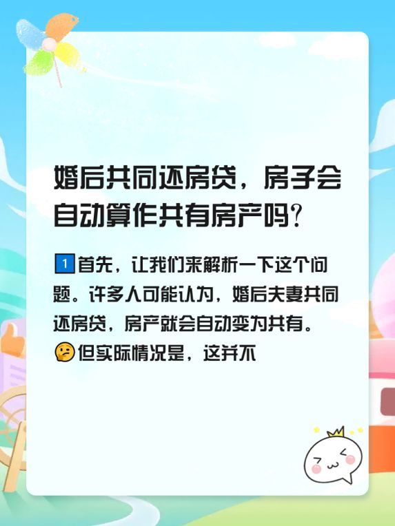 1️⃣首先,让我们来解析一下这个问题。许多人可能认为,婚后夫妻共同还房贷,房产就会自动变为共有。🤔但实际情况是,这并不会自动导致房产变为共有。🙅♀️