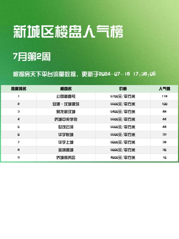 以上就是新城区人气楼盘榜单的前3名🏅,希望这些信息能给大家买房提供有用的参考!如果有兴趣,赶快去实地看看吧😉。