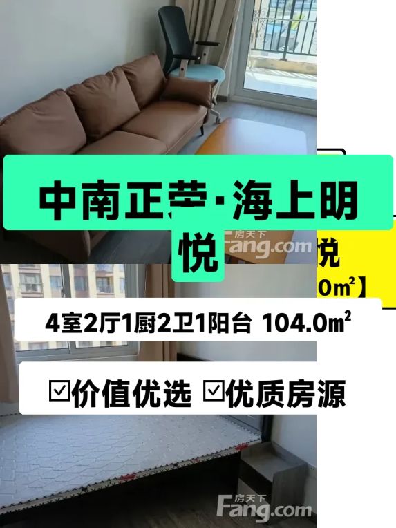 最近打算把自家这套房子租出去,真的有点舍不得呢!房子在中南正荣·海上明悦,104平米的4室2厅,南北通透的户型超级舒服,阳光从早晒到晚🌞。我家在9楼(总高15层),2梯2户的设计,平时上下楼不用等电梯,特别方便~