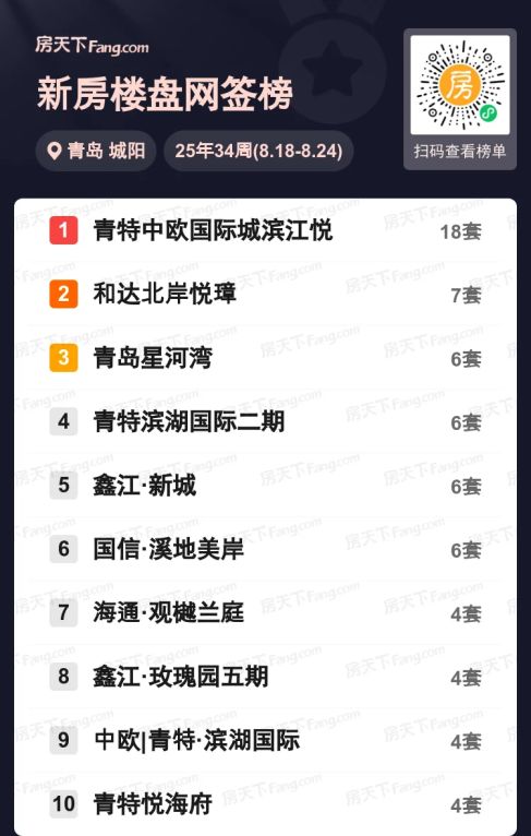 上周青岛城阳新房市场又掀热潮!青特中欧国际城滨江悦以单周18套成交数据强势领衔,超出第二名近3倍。和达北岸悦璋、青岛星河湾等热门项目紧随其后,TOP5楼盘均突破6套成交。