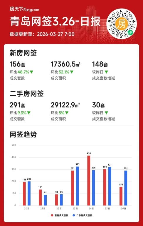 2026年03月26日青岛楼市单日成交下滑?月度数据翻倍回暖!