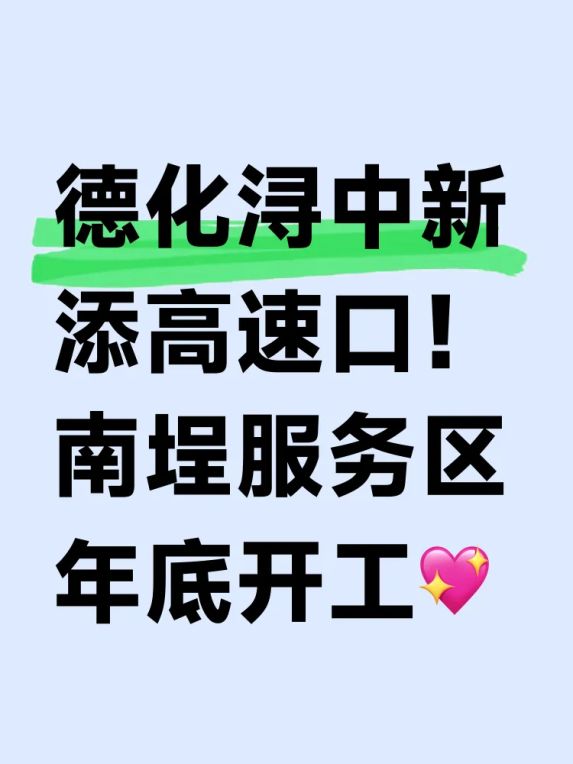 交通局9月最新文件显示,政永高速德化段即将在明年底启动浔中镇石鼓村的北出入口建设,规划中的项目占地面积暂时保密。这可是继现有东、石龙溪、石牛山三个出入口后,给西北片区居民的新年礼包!