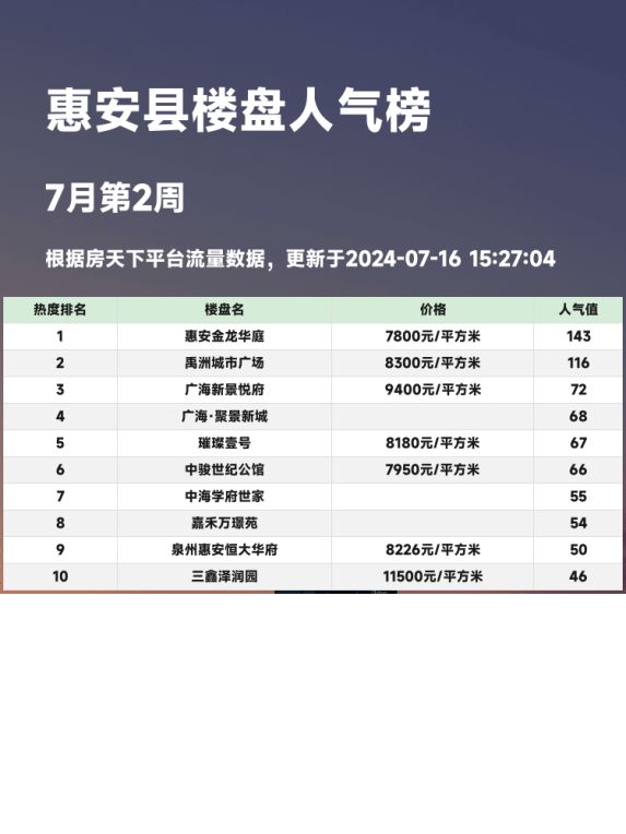 📊 在当前的买房市场中,选择一套适合自己的房子,既要关注价格,又要注意周边配套和交通便利性。人气楼盘榜单就是为购房者提供实用信息的绝佳工具。今天,我们就来看看惠安县的人气楼盘榜单,看看哪些楼盘成为了购房者心中的宠儿吧!
