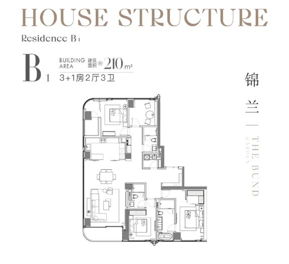 ①210㎡户型只有三房,次卧被消防通道占掉半面墙