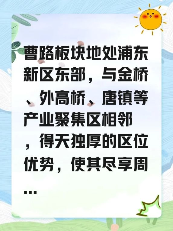 曹路板块地处浦东新区东部,与金桥、外高桥、唐镇等产业聚集区相邻 ,得天独厚的区位优势,使其尽享周边板块的辐射利好。金桥定位现代智造创新中心,部分产业园区落在曹路范围内;外高桥作为国家进口贸易促进创新示范区,其港区六期单元也位于曹路;唐镇当下的银行卡产业园二期单元部分同样处于曹路。曹路与金桥形成锯齿形耦合,比如金桥打造的申江地区中心——金鼎天地,相当部分土地就在曹路,这是一个总体量275万方的航母级城市综合体,集办公、商业、娱乐、生活等功能于一体,一站式满足您的所有需求。此外,地铁9号线作为上海东西轨交的交通动脉之一,沿线商圈能级高,可畅达金桥、陆家嘴、徐家汇、漕河泾等科创产业高地,在建的轨交崇明线也让曹路进一步融入浦东地区的轨交网络,出行更加高效便捷 。