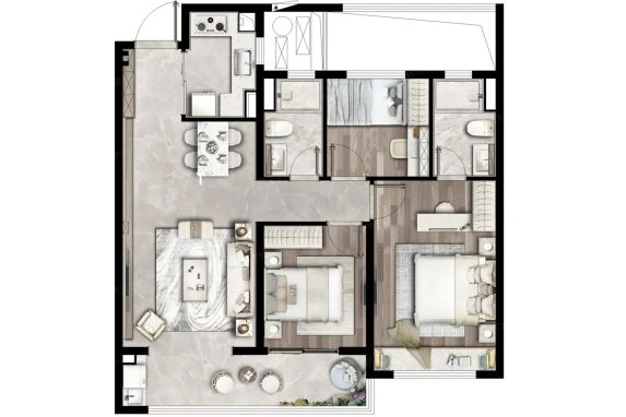 最满意的就是户型设计啦!三个卧室都方方正正的,主卧放完1.8米大床还能摆下衣柜和梳妆台。客厅连着阳台,晾衣服、养绿植都超方便🌿