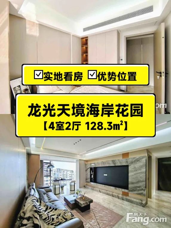 这套房子真的太香了!🔥 龙光天境海岸花园20楼(总高30层)的精装4房,南北通透的板楼设计,128.3㎡的方正户型,2023年建的新房还带满二产权!业主诚意出售只要207万,性价比超高!