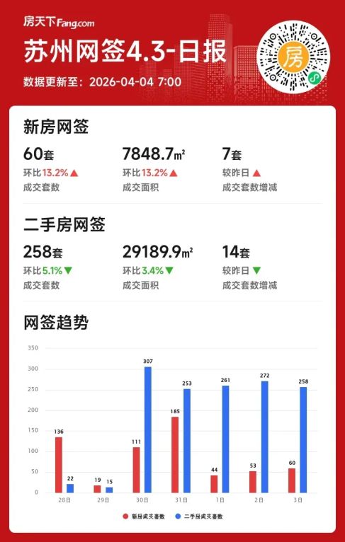 2026年04月03日苏州楼市分化:新房日成交回暖二手微跌,月度二手猛增