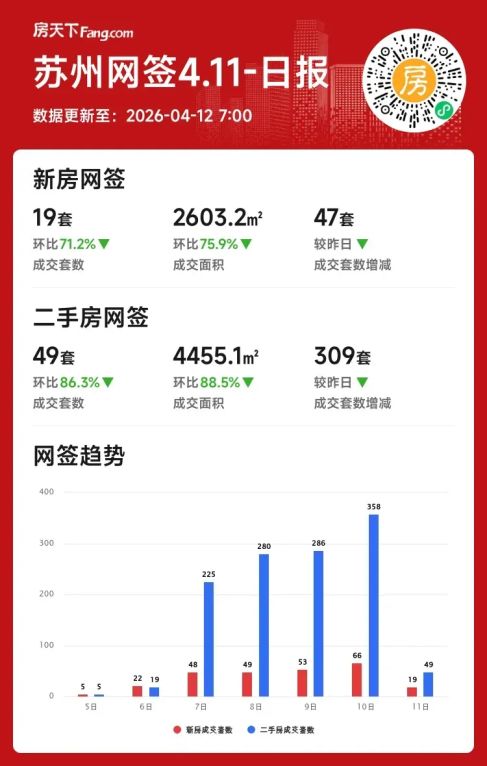 2026年04月11日苏州楼市降温?单日成交环比大跌超七成!