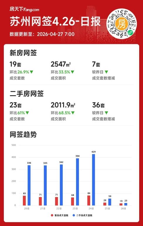2026年04月26日苏州楼市分化:二手房月成交上扬,新房日成交遇冷