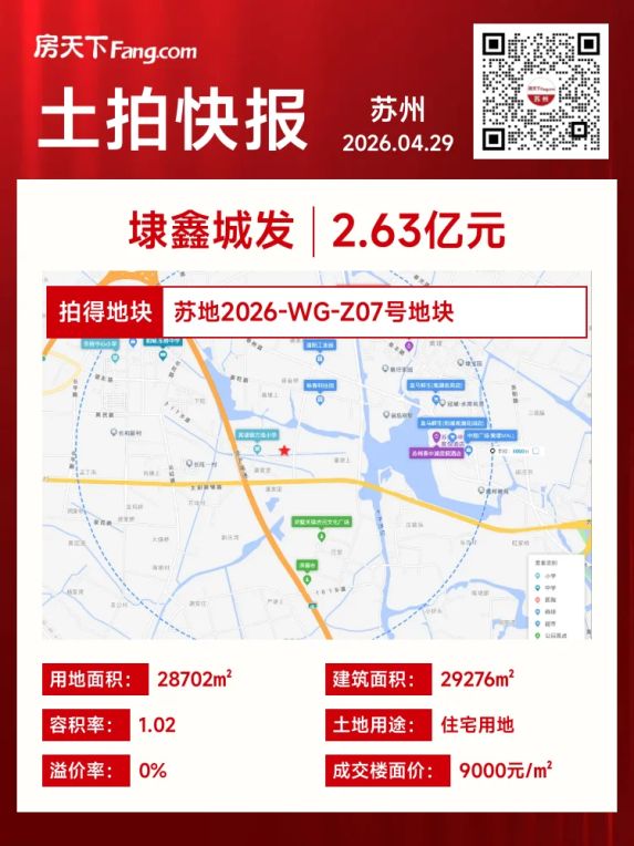 📢 苏州相城区黄埭镇春祥路北、冯梦龙大道西的苏地2026-WG-Z07号地块,于4月29日由苏州埭鑫城市发展有限公司以总价2.63亿元竞得,成交楼面价9000元/㎡,溢价率0.00%。